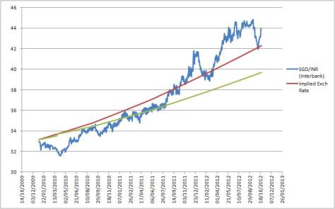 Here is the chart that gives the implied SGD INR rate based on Interest rates…Rule of the thumb is to convert whenever the Exchange rate stays above the Red line.