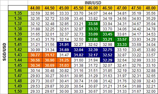 The cells in dark green indicate the current range of SGD-INR depending on the rates of SGD and INR against the USD.